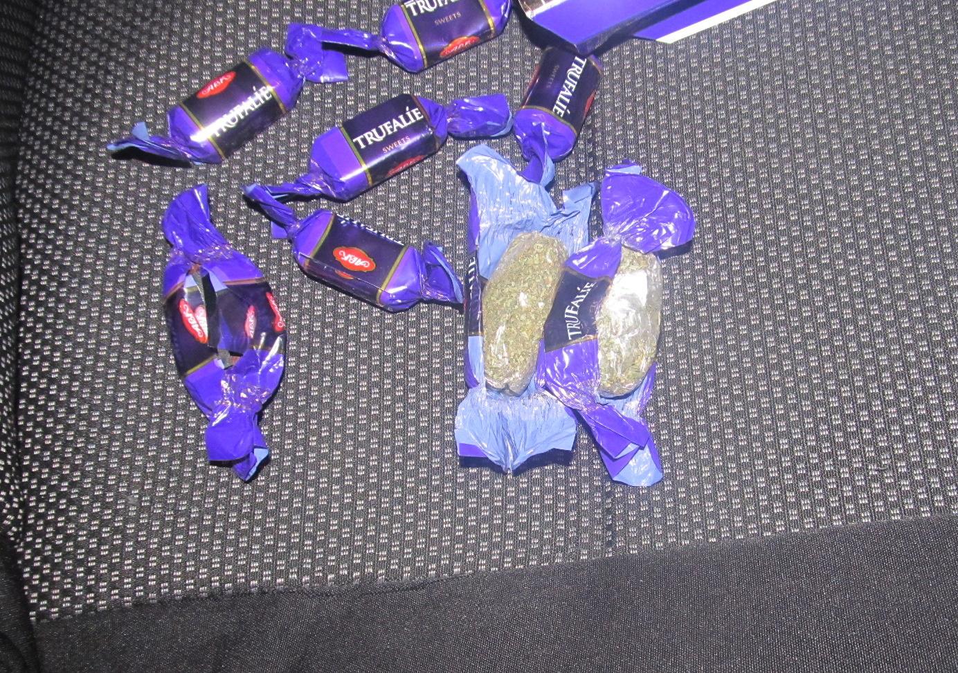 Находились они в коробке из-под конфет. Между вкусными шоколадными сладостями были обнаружены и конфеты иного производства. Изобретательный человек замотал серо-зеленое вещество, вероятно марихуану, в обертки, и таким образом надеялся провезти зелье через границу.