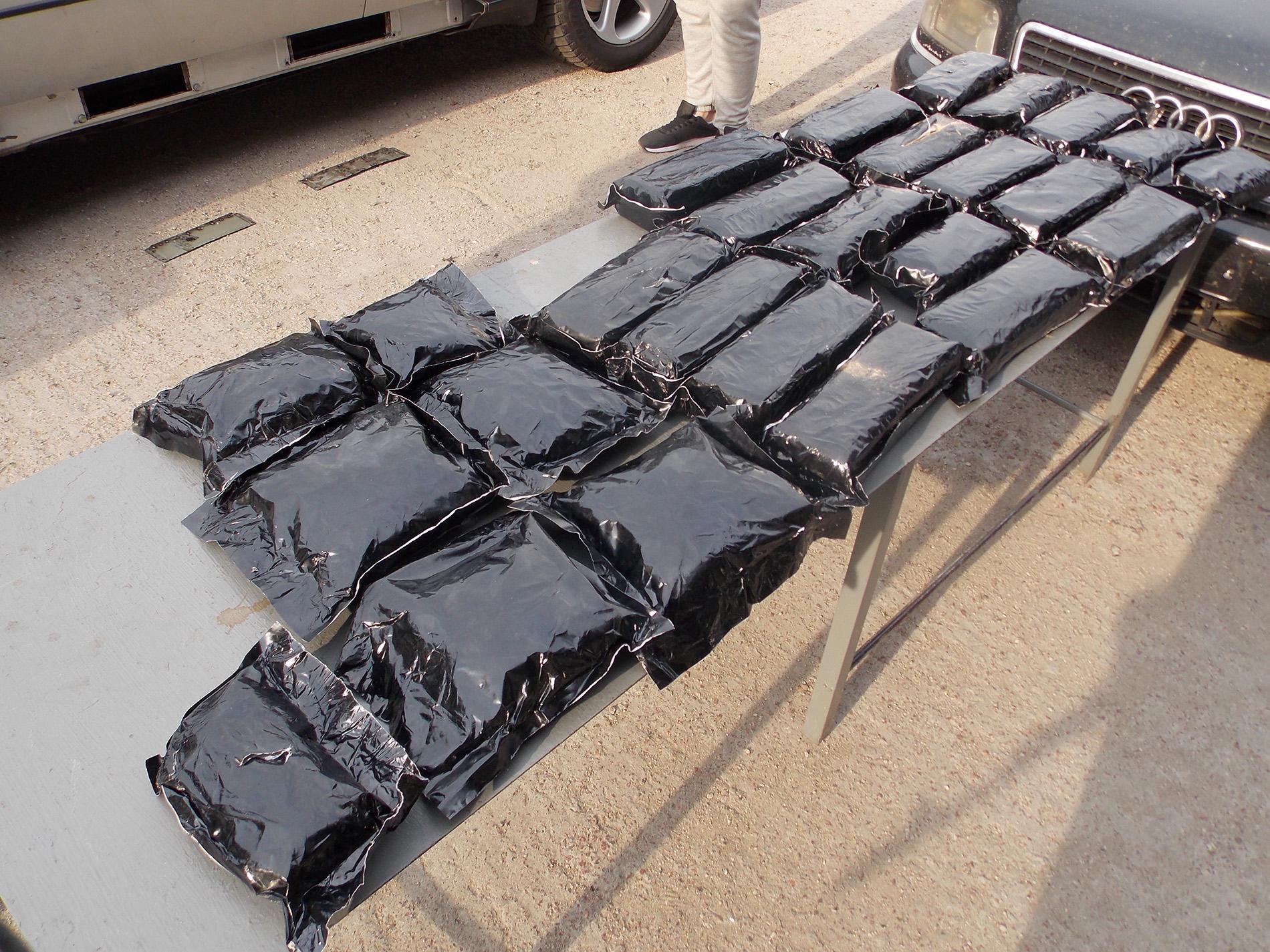 Автомобиль направили на углубленную проверку, где после демонтажа конструктивных элементов кузова обнаружили специально оборудованный тайник. В нем находились 26 свертков с порошкообразным веществом общим весом 26 кг. По внешним признакам часть вещества похожа на героин, а другая на медицинский опиум сырца.