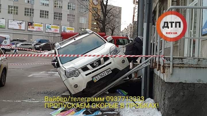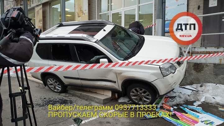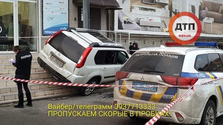 В Киеве на улице Сурикова произошла перестрелка и ДТП. Автомобиль Ниссан залетел на ступеньки магазина. На месте инцидента много полиции, введен оперативный план «Сирена».