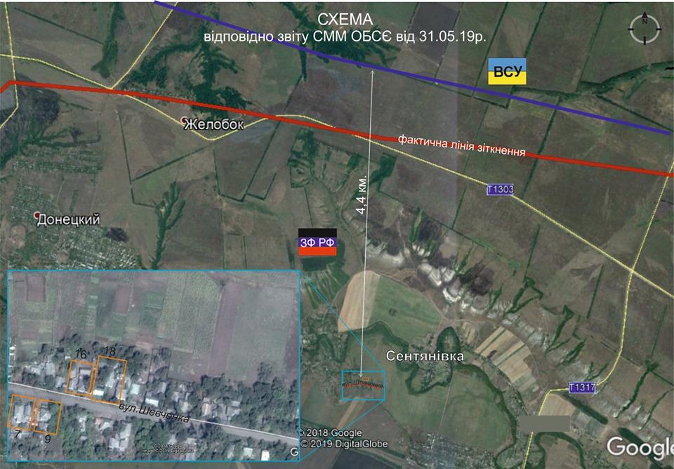 По данным отчета СММ ОБСЕ, опубликованном 31 мая 2019 г. указано, что 29 мая в н. п. Сентяновка, что на временно неподконтрольной правительству Украины территории к западу от Луганска, члены патруля Миссии видели повреждения 6 домов, из которых 3 расположены на северной стороне улицы Шевченко, а еще 3 - на южной стороне этой же улицы.