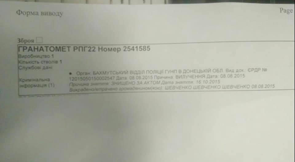 Сегодняшний «герой» дня, гранатомет РПГ-22, индивидуальных номеров нет, но имеет номер партии производства. Такой же номер партии - РПГ-22 254-15-85 - имели два гранатомета, изъятые в 2015 году из тайника «ДНР», который нашли наши военные возле кладбища при выезде Артемовска в направлении трассы Славянск Дебальцево. Те гранатометы были уничтожены (на фото - справка об уничтожении одного, по второму форма абсолютно идентична). Их «брат» из той же партии производства обстрелял сегодня 112 канал", - написал Арьев.