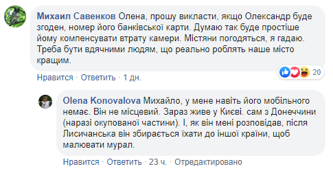 В комментариях к посту горожане отметили, что у художника, очевидно, останутся не самые хорошие воспоминания о Лисичанске. Некоторые пользователи предложили организовать сбор денег, чтобы компенсировать Корбану стоимость украденной камеры.