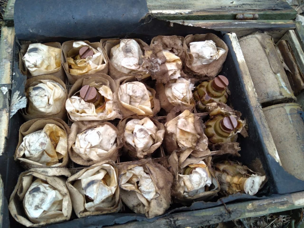 В тайнике обнаружено 6 единиц гранатометов РПГ, 3 единицы МОН, ящик гранат Ф-1 с запалами к ним, 20 гранат РГД-5 с запалами к ним, ящик с тротиловыми шашками, взрывные пакеты, запалы, капсюль-детонаторы, граната ГКГ - ЗЭМ, пластид и осветительные ракеты.