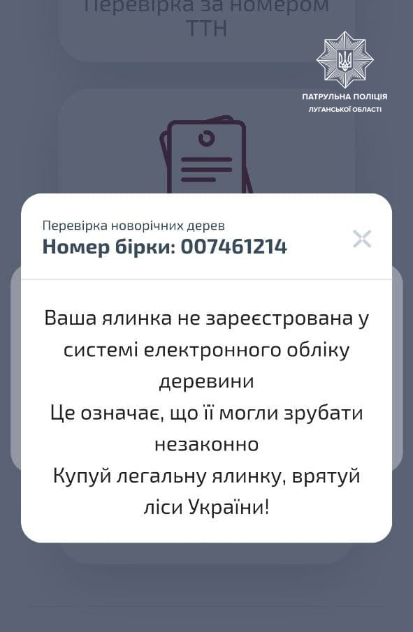 Проверив бирки елок по базе "Государственного агентства лесных ресурсов Украины", инспекторы установили, что елки не зарегистрированы в системе электронного обращения древесины. Что могло свидетельствовать о том, что деревья срублены незаконно.