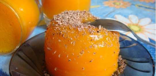 2. Предварительно замочите желатин в холодной воде согласно инструкции на этикетке. После этого, распустите его на водяной бане, а затем разведите в 100 мл тыквенного отвара. Добавьте лимонный сок, мякоть тыквы и хорошо все перемешайте. Полученную смесь доведите до кипения, снимите с огня и влейте в нее апельсиновый сок.