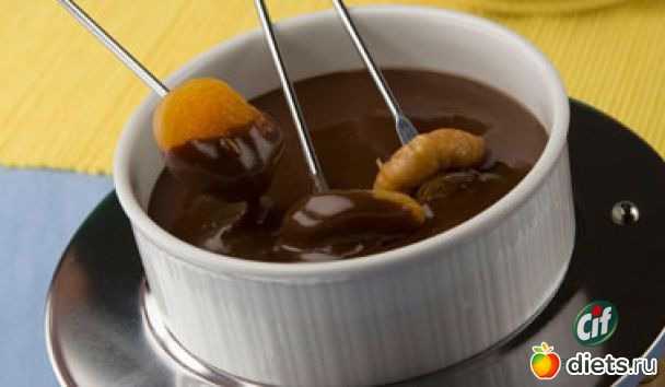 Сухофрукты откиньте на дуршлаг и разложите на 4 тарелки. С помощью вилок для фондю обмакивайте их в горячий шоколад.