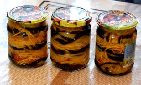 В перетертую морковь добавляем чеснок и горький перец. Все овощи готовы к консервации. В хорошо вымытые пол литровые баночки, первым слоем укладываем баклажаны, вторым слоем – морковь с чесноком и перцем, далее выкладываем лук и так до самого верха чередуем слои.