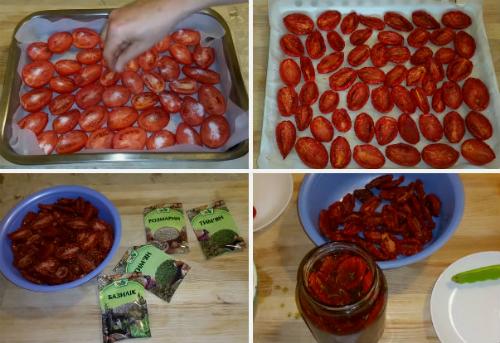Прогреваем духовку примерно 2 минуты и отправляем в нее томаты. Рабочая температура, при которой правильно готовятся вяленые томаты – 40-70 град. (см. видео). На весь процесс уйдет 7-12 часов. После 12-часовой процедуры, томат полностью готовы. Переходим к заправке. Оливковое или растительное масло нагреваем до 50 градусов и отправляем в него 1 ч. л. с горкой тимьяна, 1 ч. л. с горкой розмарина и 2 ч. л. с горкой базилика. В течение нескольких минут хорошенько все размешиваем, накрываем крышкой и даем минут 40 настояться. Далее на дно банки кладем чеснок и только после этого плотно укладываем дольки помидор. Заполняем банку томатами на 80%, заливаем их до верха заправкой, закатываем и оставляем их при комнатной температуре на 2 недели. После чего отправляем в прохладное место.