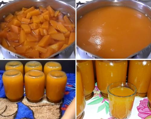 Далее все делаем очень быстро. Выключаем огонь, снимаем сок с плиты, разливаем (до самого верха) по баночкам, накрываем крышками и закатываем. С предложенных нами продуктов, у нас получилось шесть литровых баночек очень полезного и питательного сока из тыквы. Плотно закатанные баночки переворачиваем вверх дном, укутываем их чем-то теплым и в таком положении оставляем заготовки на всю ночь. Утром баночки с соком отправляем в прохладное местечко на зимовку.