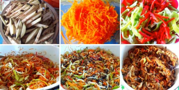 Нарезаем баклажаны тонкой соломкой, немного наискосок. Нарезка соломкой придаст этому блюду оригинальности. Далее баклажанную соломку высыпаем в большой таз, пересыпаем солью, руками все хорошенько перемешиваем и даем настояться примерно час. Пока синенькие будут пропитываться солью, мы тем временем займемся другими овощами. Начнем с моркови. Натираем морковь на специальной терке (для моркови по-корейски). Далее полностью заливаем морковную соломку кипятком и оставляем в таком положении на пару минут. Пока морковка парится, займемся перцем.
