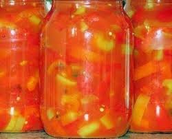 Перец промыть и порезать соломкой. К перцу добавить соль, уксус, подсолнечное масло и сахар. Из помидор делаем томатный сок (очищаем от корочек и семечек) и заливаем им перец.