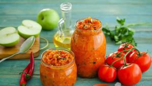 Помыть помидоры и яблоки, лук, морковь, перец, все очистить (от плодоножек и семенных коробочек) и перекрутить на мясорубке. Подсолить смесь, поставить на огонь и 15 мин прокипятить, влить масло, потомить смесь на минимальном огне еще 20-30 мин, затем положить измельченный чеснок, проварить еще 15 мин. Далее горячая икра раскладывается по стерилизованным горячим банкам, закатывается, переворачивается вверх дном и закутывается одеялом, так оставляют на сутки. Овощная икра из помидоров - это очень вкусная заготовка на зиму, которая вам обязательно сослужит хорошую службу, сделайте ее и сможете в этом убедиться!