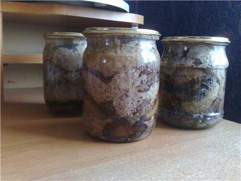 Баклажаны уложить в банки, переслаивая начинкой, злить винным уксусом, а сверху — растительным маслом (слоем 2 см). Банки стерилизовать 30 минут, а затем закатать. Хранить лучше в подвале.