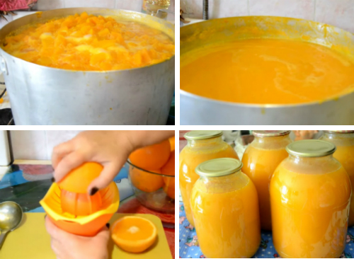 Перетертую мякоть тыквы снова ставим на огонь, добавляем апельсиновый сок, отправляем туда же сахар, лимонку, апельсиновые корочки или цедру, все тщательным образом размешиваем, доводим до кипения, варим еще 20 минут и наш витаминный тыквенно-апельсиновый сок полностью готов. Стерилизуем тару привычным вам способом и в горячем виде разливаем сок по баночкам, закатываем или закручиваем крышками, даем полностью остыть и можно отправлять тыквенный нектар в холодное помещение на зимовку.