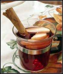В вино добить сахар, нарезанные кубиками яблоки и специи и довести до кипения. Снять с огня и оставить на 10-15 минут. отфильтровать. В каждую чашку положить ломтик лимона и несколько дополнительных кубиков яблок.