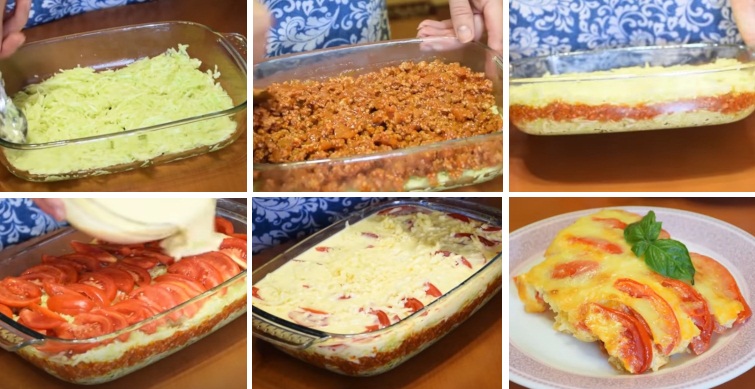 Стеклянную форму изнутри смазываем растительным маслом без запаха. Первым слоем выкладываем половину кабачков и все хорошенько разравниваем. Вторым слоем выкладываем мясную начинку и также все разравниваем. Третьим слоем снова выкладываем оставшиеся кабачки. Четвертым слоем будут нарезанные тонкими полукольцами помидоры.