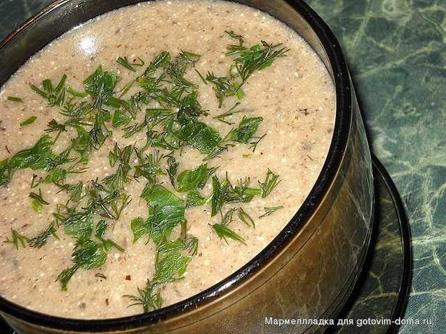 Лук обжарить на сливочном масле 5-7 минут, добавить грибы (если шампиньоны или вешенки – мелко порезать, опята оставить целыми), посолить, перемешать и жарить ещё 8-10 минут. Грибы с луком измельчить блендером до состояния пюре.