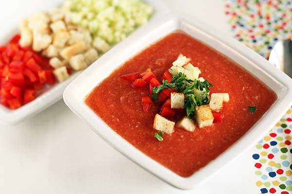 Нарезать лук. Нарезать чеснок. Помидоры очистить от кожицы, разрезать на 3-4 части. Огурцы очистить от кожуры, нарезать не сильно мелко. Болгарский перец очистить от семян, нарезать. В блендере измельчить помидоры, болгарский перец, огурцы, лук, чеснок. Добавить сок лимона.Добавить оливковое масло, посолить, поперчить. Все еще раз взбить. Суп поставить в холодильник на 3-4 часа. Готовый суп посыпать зеленью, подавать с сухариками, оливками, яичками - по желанию.