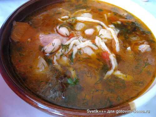 Когда картошка будет готова - в кастрюлю с супом добавим фасоль, домашнюю лапшу и зажарку из лука и томатной пасты . Перемешаем, посолим и добавим кислого квасу ,по вкусу. Варим ещё около 5 минут , не больше.