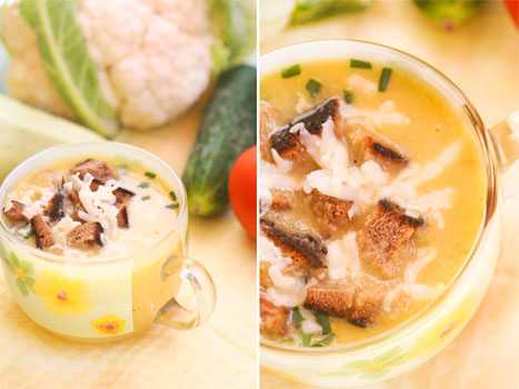 Варим суп до готовности. Готовые овощи перекладываем в блендер, добавляем бульон и измельчаем. Яйца отвариваем вкрутую, сыр натираем на терке. Раскладываем суп по тарелкам посыпаем по – желанию сыром, сухариками или добавляем нарезанные яйца.