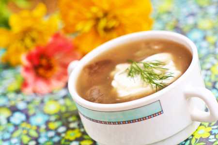 Когда вода в кастрюле закипит, высыпаем туда картофель и морковь и варим минут 7. После этого добавляем грибы с луком и варим еще 20 минут на среднем огне. Посолите, поперчите и подавайте со сметаной и зеленью.