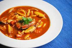 5. Добавляем овощной бульон. Солим, перчим, добавляем сухую паприку, кайенский перец, смесь итальянских трав и сок половины лимона. Доводим до кипения и добавляем пасту. Варим на маленьком огне еще 15 минут.