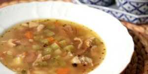 Вареное мясо выловить из бульона. Отделить мясо от косточки, мелко нарезать и положить обратно в бульон. Добавить распаренную перловку, варить на среднем огне около 15 минут. Добавить картофель - варить до готовности картофеля.