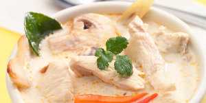 Добавить куриное мясо, соль и мускатный орех. Варить еще 5 мин. (до готовности овощей).