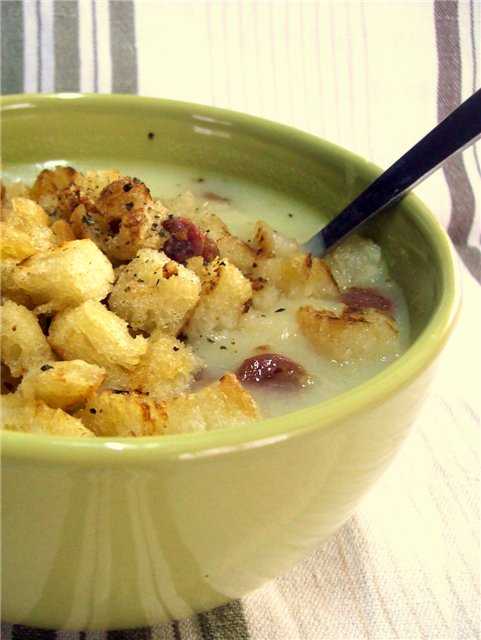 Вместе с гренками можно поджарить колбаску или бекон и тоже добавить в супчик.