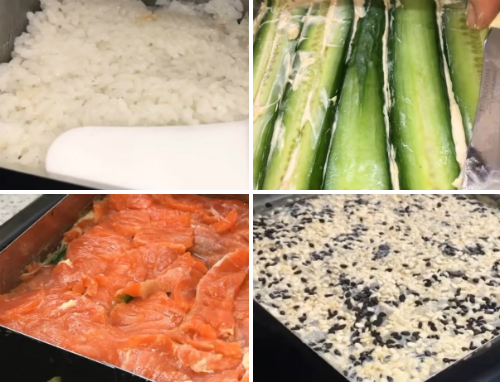 На огурцы укладываем плотно красную рыбу, если будите добавлять авокадо, то его следует уложить на рыбу. Следующий слой, это рис с нори чтобы рис не прилипал к рукам, смочите пальцы водой. Хорошо разравниваем и смазываем оставшимся сыром, сверху посыпаем кунжутом белым и черным, можно одним белым. Теперь оставляем салат настояться, примерно один час, снимаем форму и украшаем салат по своему вкусу. Приятного всем аппетита!