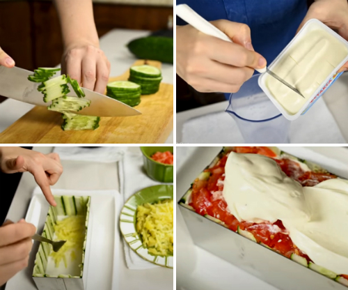 Твердый сыр натираем на терке в тарелочку. Берем вторую половину огурца, ставим в форме и отмеряем ее высоту, обрезаем лишнее, режим тонкие полоски огурца вдоль по его длине (см. видео). Берем прямоугольную форму для выпечки, смазываем дно тарелки и бортики формы маслом. Обкладываем внутри стенки формы этими огуречными полосками и выкладываем салатик слоями, первый слой салата – картофель. Слои обязательно хорошо ровняйте и заполняйте уголки. Мажем заправкой и ложем мясо, опять заправка, тертый сыр без заправки.