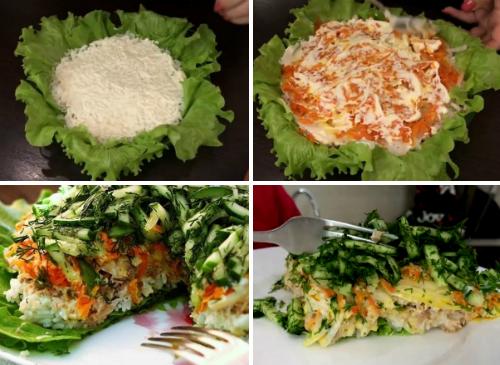 Переходим к формированию этого замечательного блюда. Листья салата мы будем использовать в качестве декора. Но, это не обязательно. Сверху на листья, первым слоем выкладываем основу, т.е. уже отваренный и немного подсоленный рис и еще совсем немного его присаливаем. Смазываем рис майонезом. Следующим слоем выкладываем горбушу и также смазываем майонезом, но, только тонким слоем. Сок из лука сливаем и отправляем его следующим слоем. Не смазывая лук майонезом, выкладываем морковь и только после этого все смазываем тонким слоем майонеза. Далее выкладываем огурец с измельченным укропом. Этот красивый, сочный салатик отправляем на час, полтора в холодильник и только перед подачей немного подсаливаем огурчики. Советуем всем приготовить этот шикарный салатик.