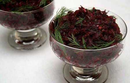 Морковь и свеклу очистить, хорошо вымыть и натереть на крупной терке. Очищенный лук мелко нарезать. Разогреть сковороду или даже лучше сотейник, добавить масло и обжарить на сильном огне, добавляя поочередно, свеклу, морковь и лук. Уменьшить огонь и тушить под крышкой, периодически помешивая, 20-25 минут. Укроп, вымыть, обсушить и мелко нарезать. Немного укропа отложить для украшения салата.