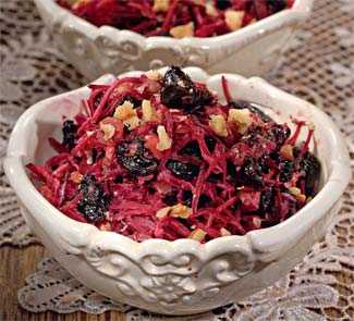 Для начала свеклу отварите, очистите и натрите на крупную терку. Свекла преимущественно варятся довольно долго - в зависимости от размеров. Орехи порубите, чернослив тоже порежьте на кусочки. Если чернослив жесткий, намочите его в течение получаса в теплой воде. Все смешайте и заправьте майонезом. По желанию добавьте в салат 2 зубца чеснока, пропустив его через чеснокодавилку.