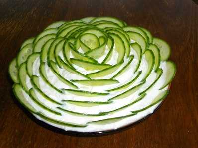 Огурец нарезать тонкими ломтиками по диагонали и начать выкладывать от центра к краям в виде розы.