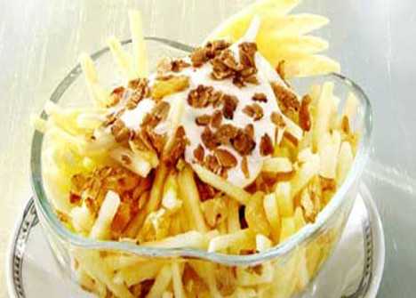 Затем натереть на крупной терке, смешать со сметаной, измельченными орехами и добавить лимонный сок.