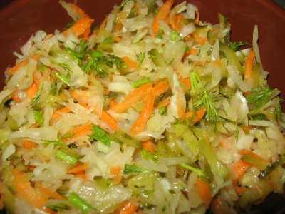 Если квашеная капуста сильно кислая или соленая надо промыть ее холодной водой, отжать и сложить в салатницу.