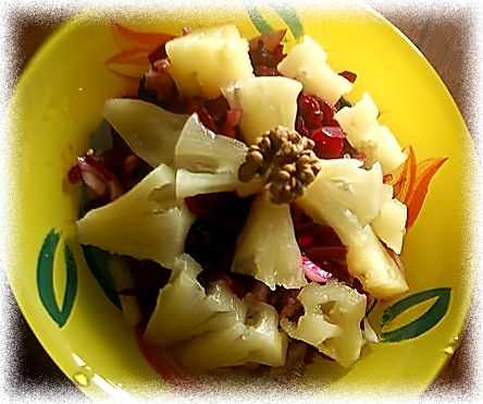 Свеклу отварить и нарезать кубиками. Мякоть ананаса мелко нарезать. Сливки взбить в стакане. Все ингредиенты смешать и полить взбитыми сливками.