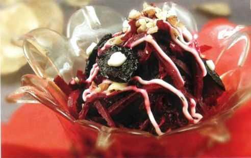 Свеклу помыть, очистить и натереть на крупной терке. Сливы, если сухофрукты, то предварительно отмочить в воде, мелко нарезать.