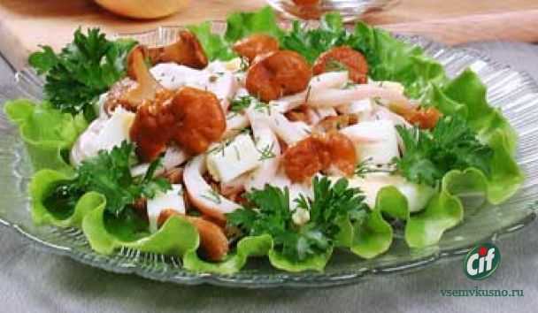 Перед подачей на стол разложите на блюде листья салата, на них – салат с крабовым мясом и грибами.