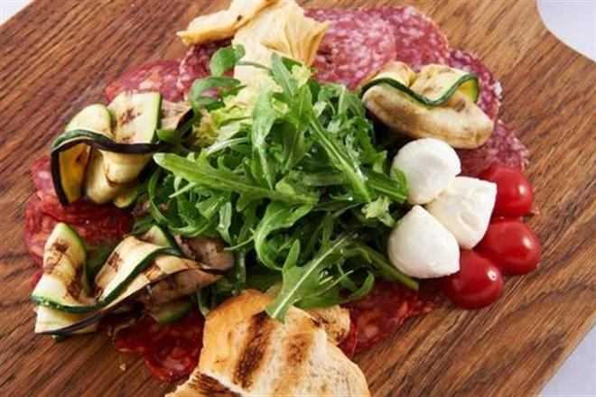 Полить заправкой так, чтобы она попала на каждый кусочек сыра. Между кусочками моцареллы разложить ломтики салями. Сверху посыпать сухариками.