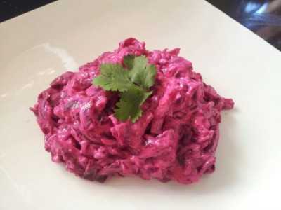 Отправляем их к свекле. Туда же выдавим зубчик чеснока. Перемешаем. Я рекомендую (если есть возможность) до подачи на стол вот так вот постоять ему минут 30, пусть пропитается.