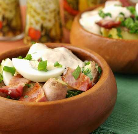 - Сложите в салатник картофель, бекон, яйца, перемешайте, заправьте соусом и украсьте зеленью.