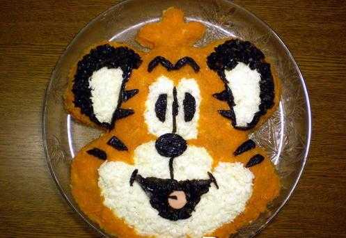 Желтые части мордочки тигра выложить из моркови, черные - из чернослива, белые - из белков.