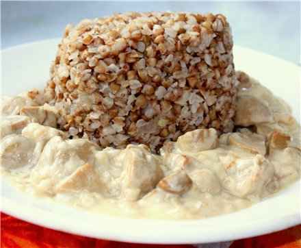 Каша: Гречневую крупу промыть несколько раз в горячей воде. Залить кипятком (бульоном), накрыть крышкой и несколькими полотенцами. Через час-полтора каша будет готова. Перемешать и заправить по вкусу. Мелко порезать луковицу, обжарить на растительном масле до золотистого цвета. Посолить, поперчить. Добавить гречневую кашу, перемешать и досолить при необходимости.