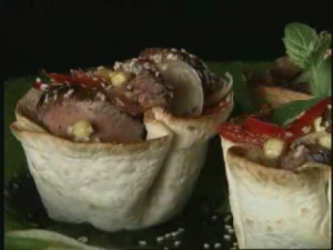 Положите 2 лепешки в форму для выпечки и смазать их с обеих сторон маслом. Выпекать в течение 1 минуты. Удалите из духовки и поместите их в вазочки, чтобы они приняли примут форму чаши. Положить их обратно в духовку на 10 минут, пока не станут хрустящими. Вынуть их и дайте им остыть.