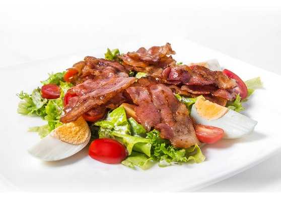 Отварные яйца порезать. Ломтики бекона поджарить и порезать на мелкие кусочки. Авокадо очистить, порезать, удалить косточки.