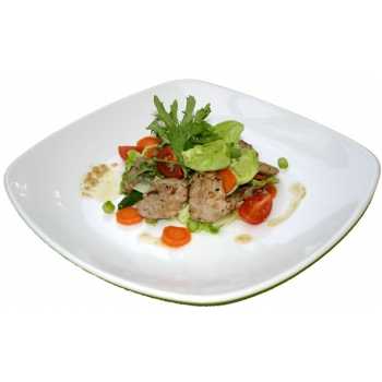 Полить салат подготовленной заправкой, украсить дольками вареных белков, посыпать зеленью.
