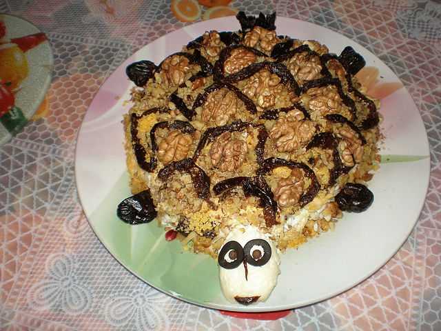 Затем украсить салат в форме черепахи. Панцирь черепахи выложить из кусочков чернослива и целых грецких орехов. Голова черепахи состоит из сыра с чесноком и майонезом. Глаза можно выложить оливками. Лапки и хвост черепахи выложить целым черносливом.