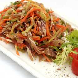 Моем и высушиваем листья салата. Язык нарезаем тонкими ломтиками, а затем соломкой. Отправляем в миску к салату.